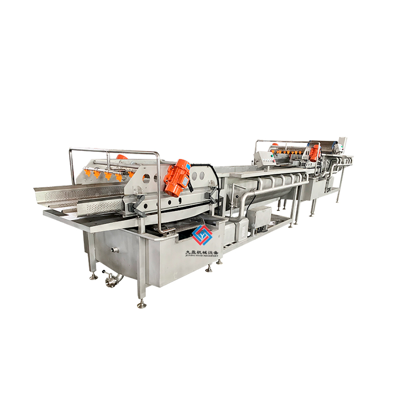 凈菜加工成套生產(chǎn)線是針對多種的蔬菜進行清洗和加工處理的,可以將蔬菜表面的泥土進行清洗干凈,還能夠?qū)κ卟诉M行農(nóng)殘?zhí)幚恚梢詫⑹卟说霓r(nóng)藥進行分解,提升蔬菜的品質(zhì)程度,通過清洗之后的蔬菜輸送到震動篩進行麗水處理,能夠?qū)⑹卟松洗蟛糠值乃譃r干,之后輸送到風干設(shè)備上可以將蔬菜的表面水分更加充分的蒸發(fā),之后再進行整理過后可以進行真空包裝處理,經(jīng)過真空包裝處理之后的蔬菜可以延長保鮮時間,建議填充質(zhì)量的氮氣可以使保鮮效果好。